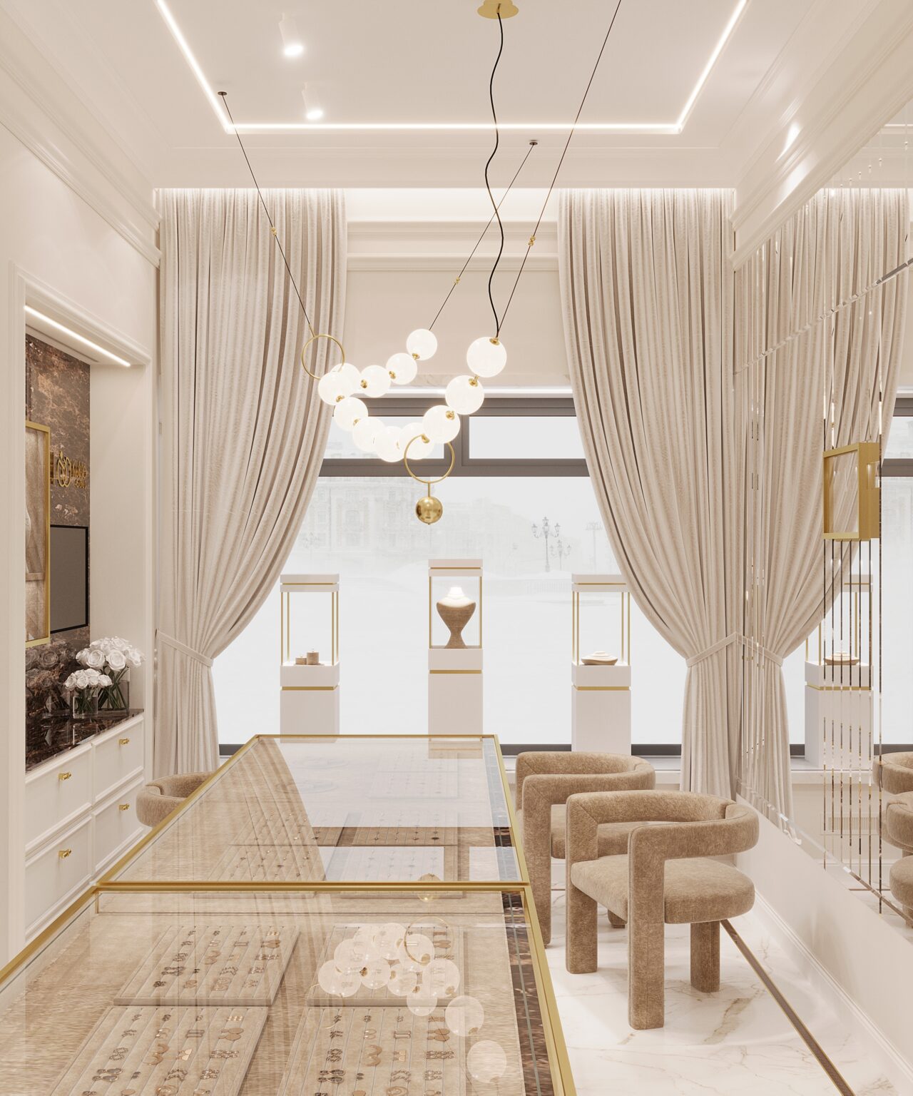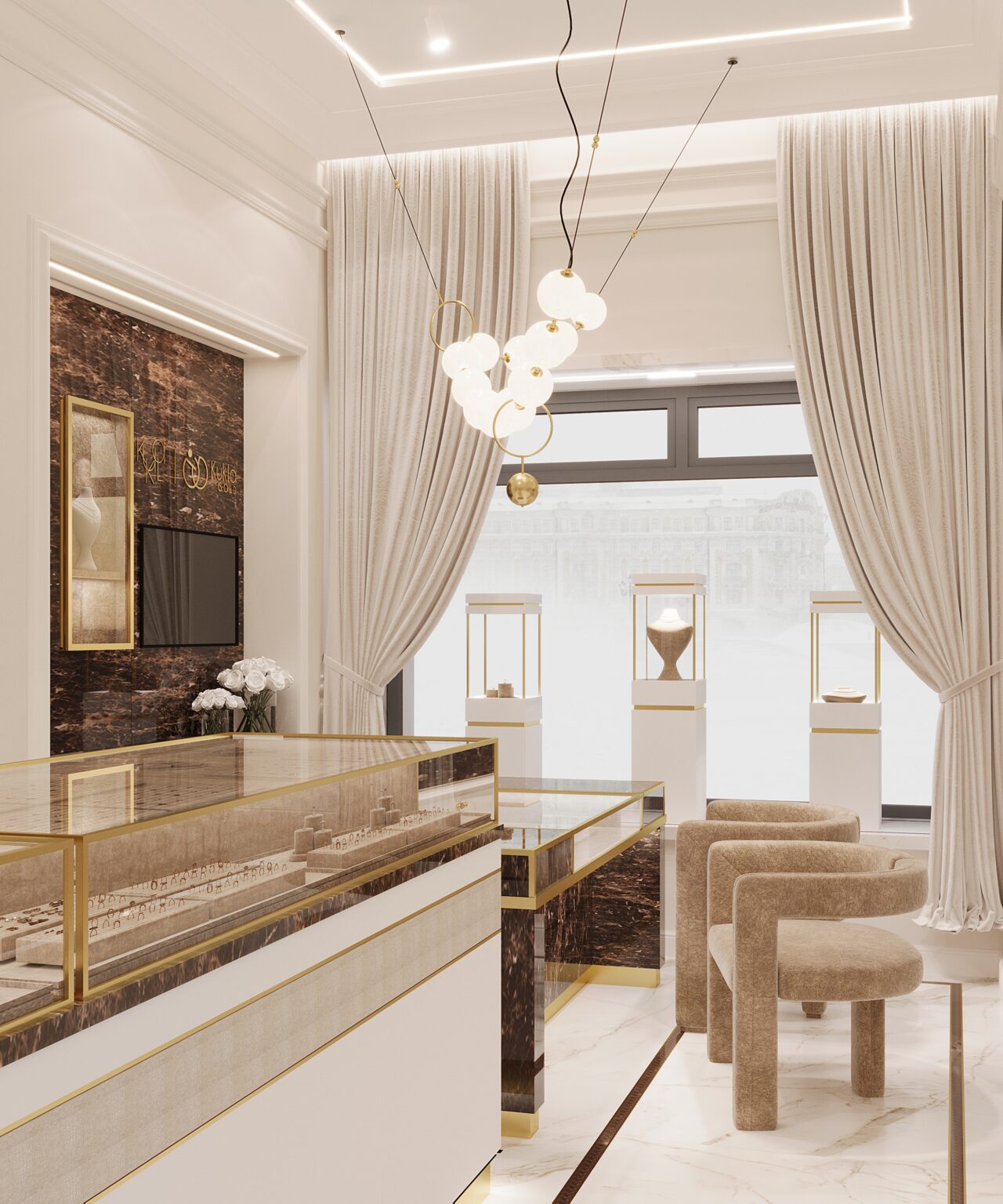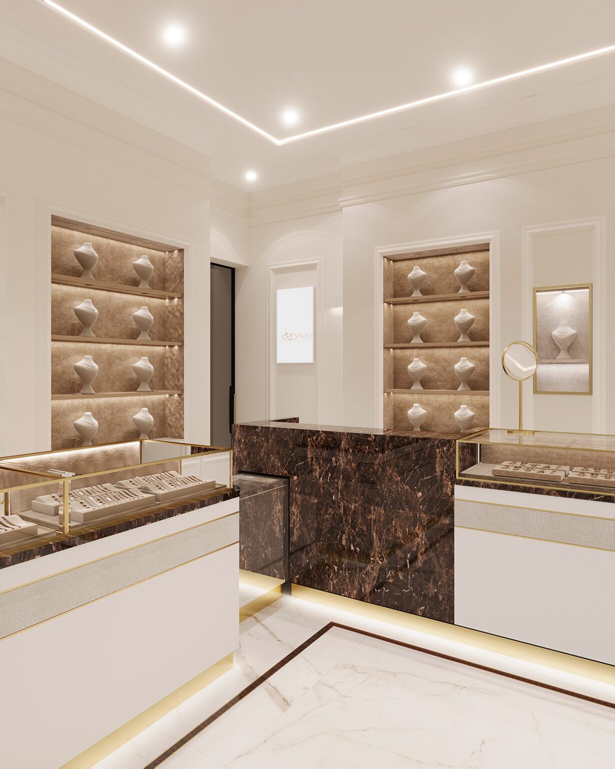 Projekt salonu jubilerskiego był od zawsze na liście moich marzeń! Marka Kukla Gold to rodzinna pracownia jubilerska z ponad 60-letnią historią. Dlatego ważne było nie tylko podejście estetyczne i funkcjonalne, ale przede wszystkim produktowe. Ze względu na to, że każdy cm2 musiał zostać dobrze wykorzystany wprowadziliśmy narzędzia z zakresu psychologii przestrzeni. Przeprowadziliśmy analizę zachowań użytkownika i komunikacji po obiekcie w istniejącym lokalu. Na tej podstawie przygotowaliśmy rzut funkcjonalny z uwzględnieniem ekspozycji jubilerskiej, tak aby wszystkie zakupy kompulsywne odbywały się w strefie wejścia, gdzie miejsca jest najwięcej. Dalej ekspozycja przechodzi w towary lukusowe oraz w stanowisko obrączkowe i zamówień indywidualnych. Puntem wyjścia w projekcie była ciepła i kolorystyka, która eksponuje pięknie biżuterię. Ale jednocześnie musiała być zbalansowana odpowiednią ilością bieli i akcentami czegoś mocniejszego. Ważnym elementem są projektowane są na zamówienie gabloty, w których przekrojach zintegrowana jest listwa oświetleniowa, dzięki czemu została subtelnie ukryta, a jednocześnie równomiernie doświetla całą ekspozycję. Odcień gablot jest dopasowany do dodatków w odcieniu mosiądzu, ale tym samym na tyle stonowany żeby wzrok kierował się od razu na biżuterię.