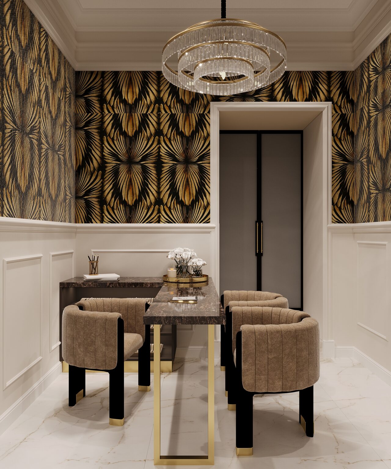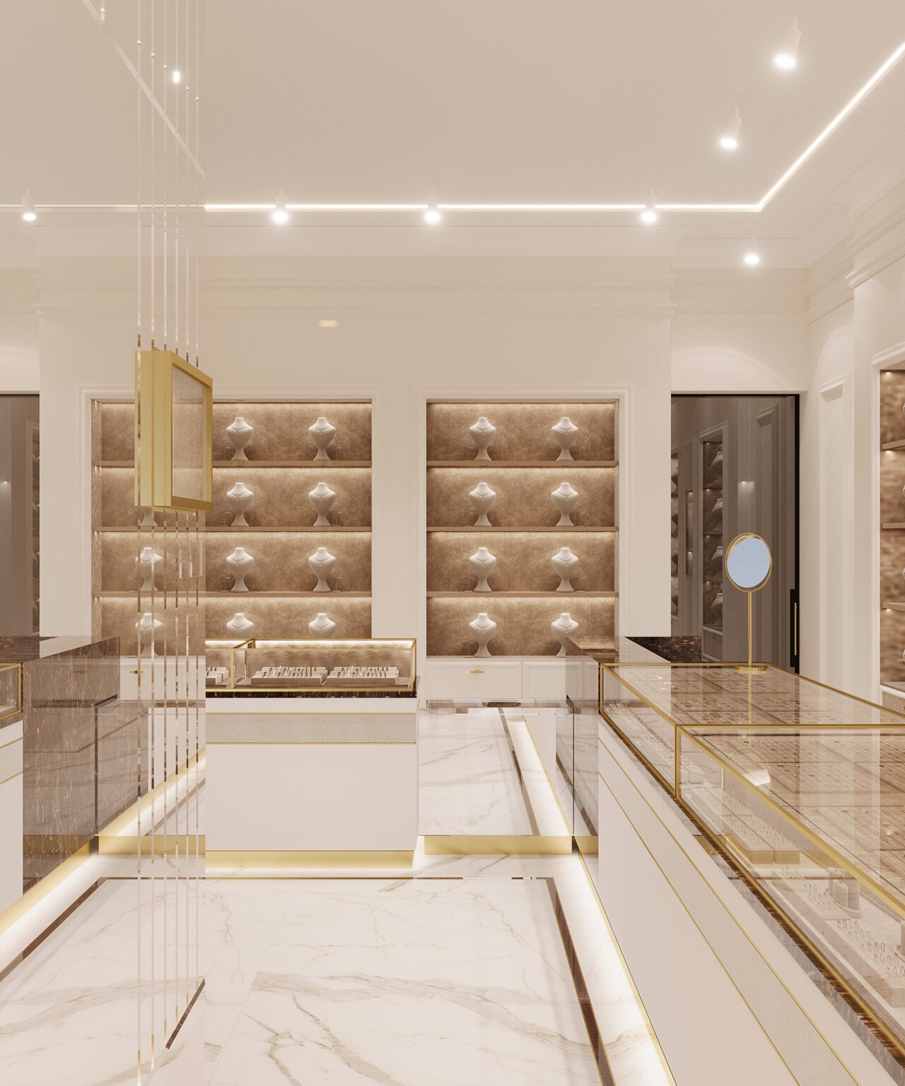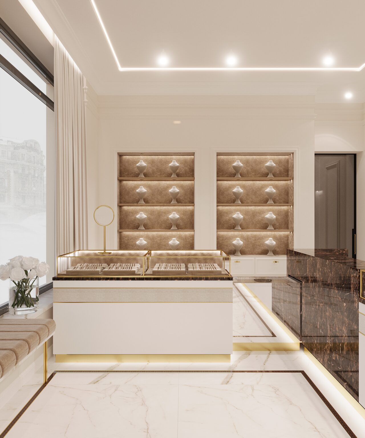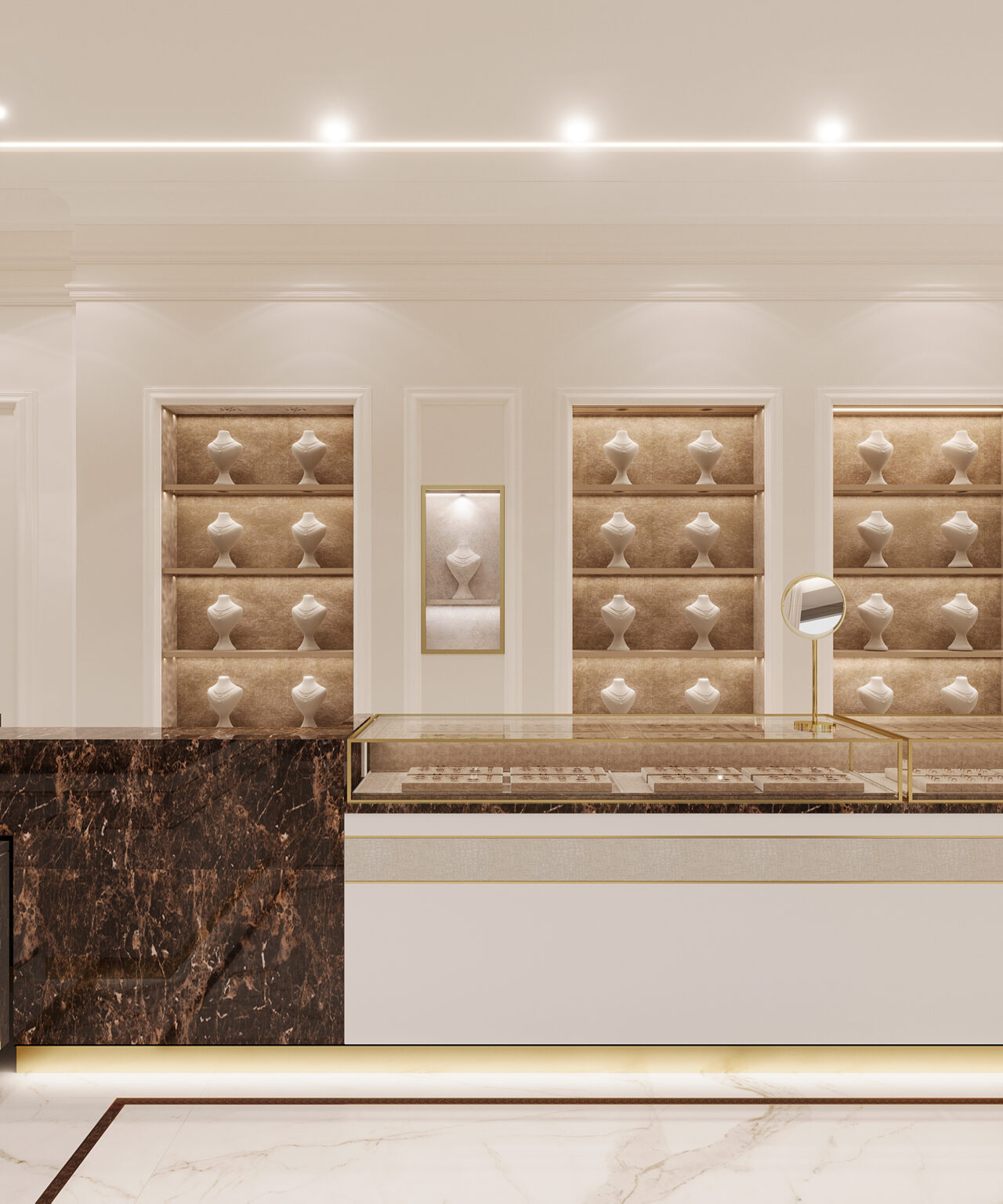 Projekt salonu jubilerskiego był od zawsze na liście moich marzeń! Marka Kukla Gold to rodzinna pracownia jubilerska z ponad 60-letnią historią. Dlatego ważne było nie tylko podejście estetyczne i funkcjonalne, ale przede wszystkim produktowe. Ze względu na to, że każdy cm2 musiał zostać dobrze wykorzystany wprowadziliśmy narzędzia z zakresu psychologii przestrzeni. Przeprowadziliśmy analizę zachowań użytkownika i komunikacji po obiekcie w istniejącym lokalu. Na tej podstawie przygotowaliśmy rzut funkcjonalny z uwzględnieniem ekspozycji jubilerskiej, tak aby wszystkie zakupy kompulsywne odbywały się w strefie wejścia, gdzie miejsca jest najwięcej. Dalej ekspozycja przechodzi w towary lukusowe oraz w stanowisko obrączkowe i zamówień indywidualnych. Puntem wyjścia w projekcie była ciepła i kolorystyka, która eksponuje pięknie biżuterię. Ale jednocześnie musiała być zbalansowana odpowiednią ilością bieli i akcentami czegoś mocniejszego. Ważnym elementem są projektowane są na zamówienie gabloty, w których przekrojach zintegrowana jest listwa oświetleniowa, dzięki czemu została subtelnie ukryta, a jednocześnie równomiernie doświetla całą ekspozycję. Odcień gablot jest dopasowany do dodatków w odcieniu mosiądzu, ale tym samym na tyle stonowany żeby wzrok kierował się od razu na biżuterię.